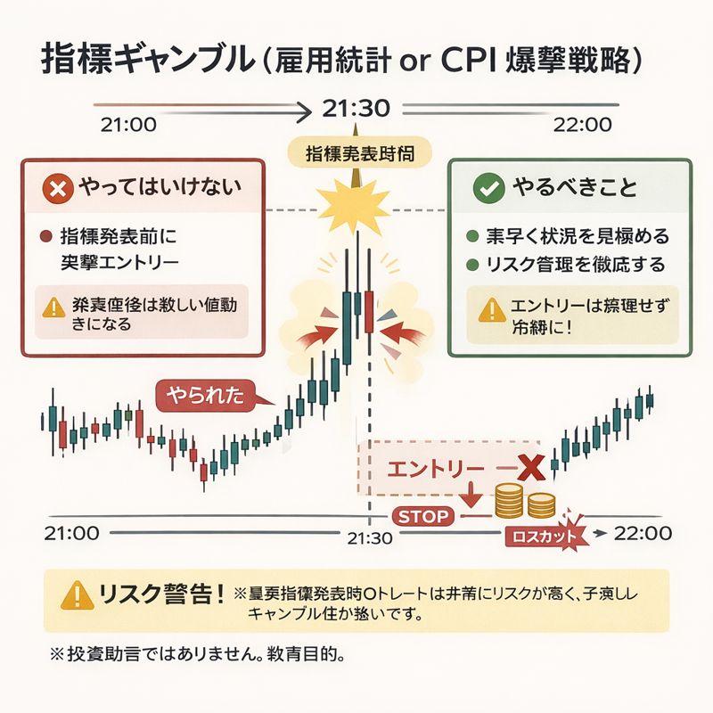 「雇用統計(NFP) or CPI で“指標ギャンブル”をやる人が好む“爆撃(=発表直後の瞬間値幅を取りに行く)”」を、仕組み→代表的な戦法→なぜ死にやすいか→それでもやるなら最低限の設計の順で、できるだけ実戦寄りにまとめた解説です。