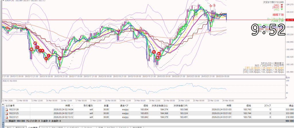 3月24日のユーロ円は、かなり強い地合いで見ています。結論からいうと、今日は「ユーロが特別に強い」というより、円が売られやすい環境の中でユーロ円が押し上げられている日です。ロイターの数字をもとに見ると、アジア時間のユーロは対ドルで1.1603ドル前後、ドル円は158.54円前後で推移しており、単純計算ではユーロ円は183.95円前後になります。別の同日ロイター記事の時点でも、ユーロ1.1593ドル、ドル円158.61円で、ユーロ円は183.88円前後となり、今日の市場が高値圏を維持していることがわかります。